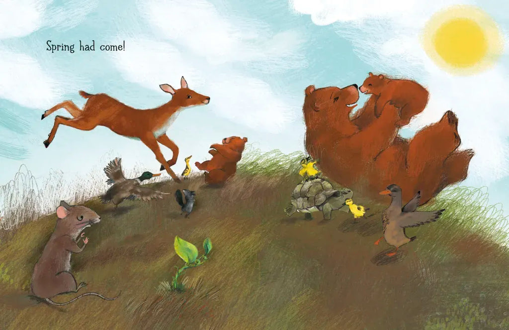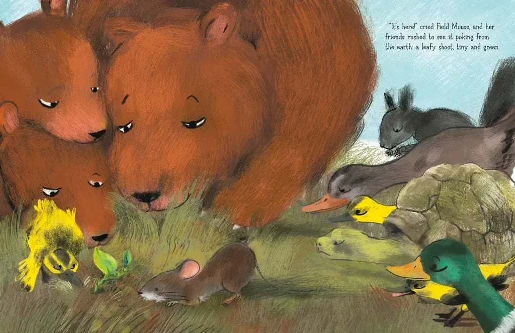 And so it goes, as Turtle, the Ducks, and the Bears join the group, all making their way to the Something on the Hill. As they climb to the tippy-top, this parade of animals will discover just what that Something is: a leaf shoot, tiny and green.