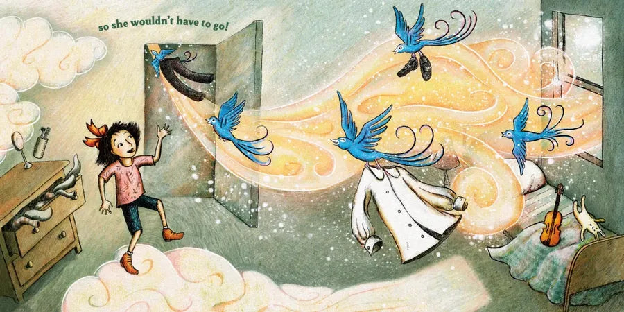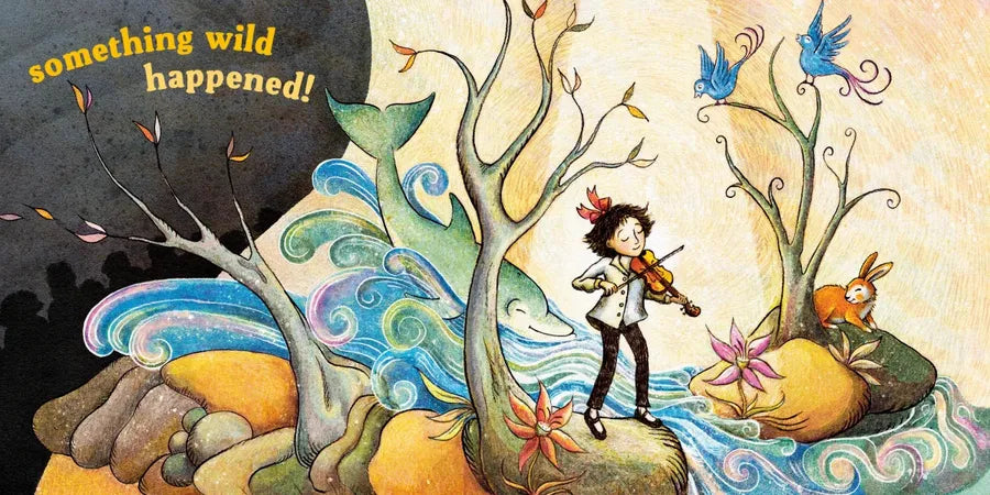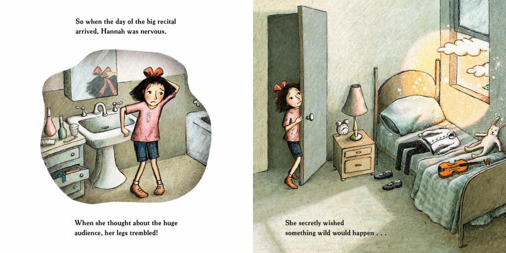 Hannah loves to play her violin—as long as no one is watching. On the day of the recital, she’s wishing something wild would happen so she won’t have to go. Perhaps a dolphin will jump out of the fountain and carry her away, or a giant rabbit will abscond with her violin. Hannah’s big imagination dreams up all kinds of entertaining scenarios that could change the course of her day, but what actually happens is the most amazing of all!
