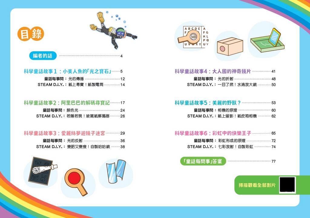 本書就以物理學中的重要的知識領域「光學」為主題,重新改編了6個經典童話,加入趣味科學元素。每篇故事後附有「童話每事問」專欄,講解故事背後的科學原理;「STEAM D.I.Y.」專欄就以清晰圖文和影片,指示怎樣利用日常用品,製作實驗去解決生活問題。