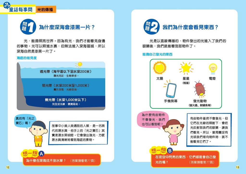 每篇故事之後,附有「童話每事問」專欄,引導讀者在故事之中找出疑惑的地方,以一問一答的形式啟發他們思考相關科學原理,並以生活例子作延伸學習。本冊的知識點包括光的各種特性與應用:光的傳播、顏色光、光的反射和折射、彩虹的形成、相機的原理。