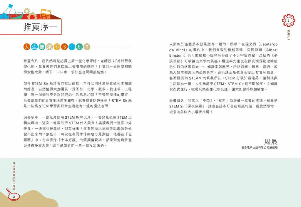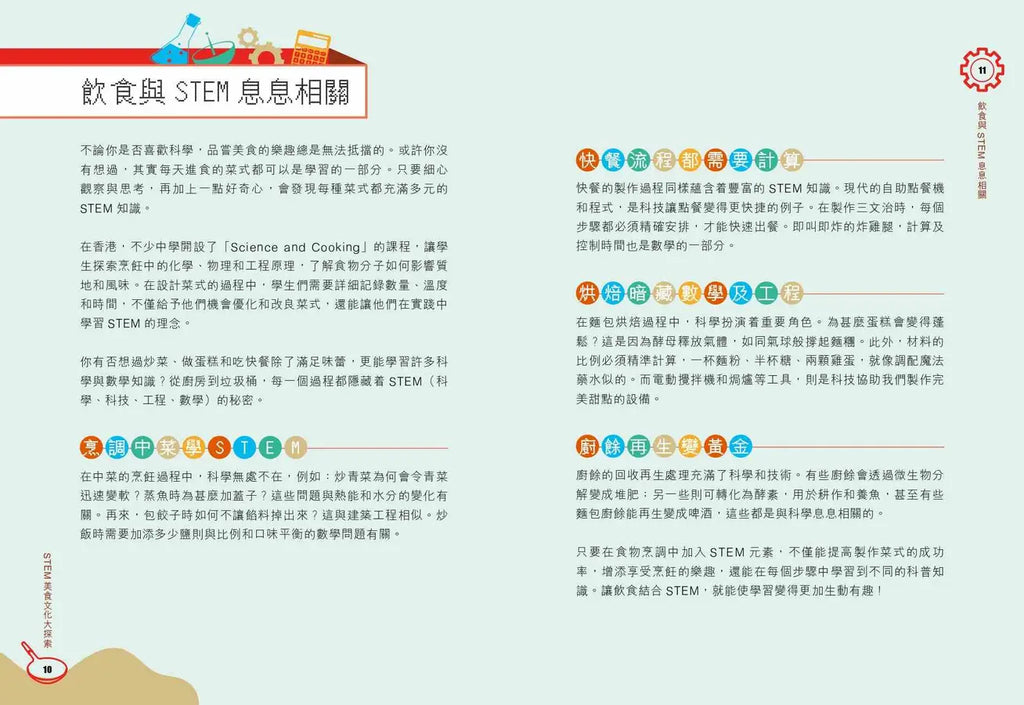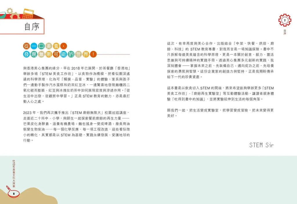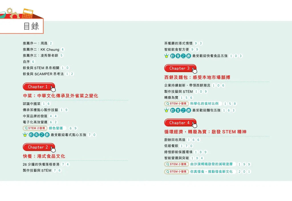 STEM Sir在本書中,親自拆解製作美食及廚餘再生背後的STEM元素,如何運用創意工具奔馳法(SCAMPER),以多角度思考方法激發創意,打開思路,探索科普知識,並體現香港獨有的飲食文化,寓美食於學習體驗!