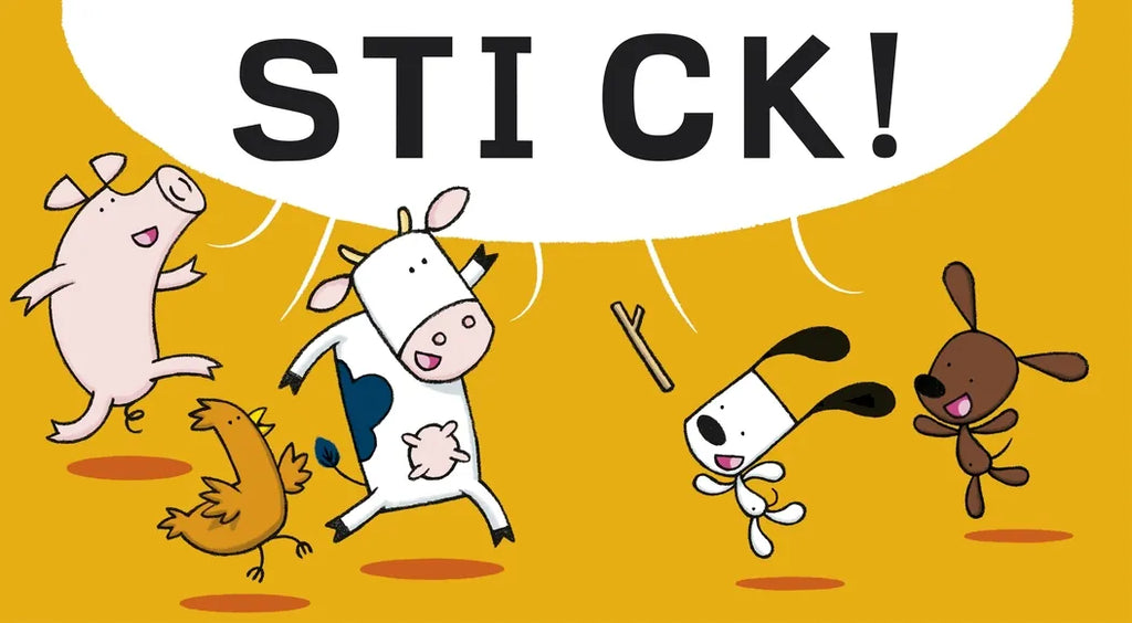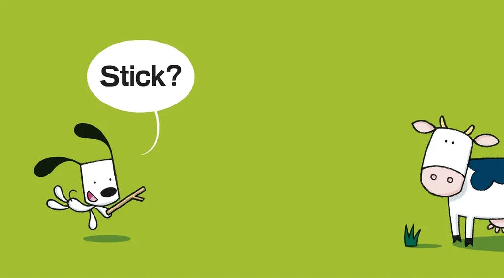 Puppy is thrilled when he discovers a stick just waiting to be tossed and chased. But Cow is more interested in grass, and Chicken is more interested in a worm. In fact, all of Puppy’s friends are busy doing something besides playing with a stick. Poor Puppy! Finally, another equally enthusiastic canine comes along, and the rousing game of fetch that ensues is enough to inspire the entire barnyard to give the stick a chance. In bold, graphic spreads, Andy Pritchett’s adorable animal cast enlivens a six-word story of friendship and play too sweet and simple to ignore.