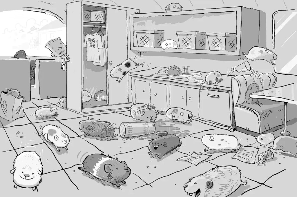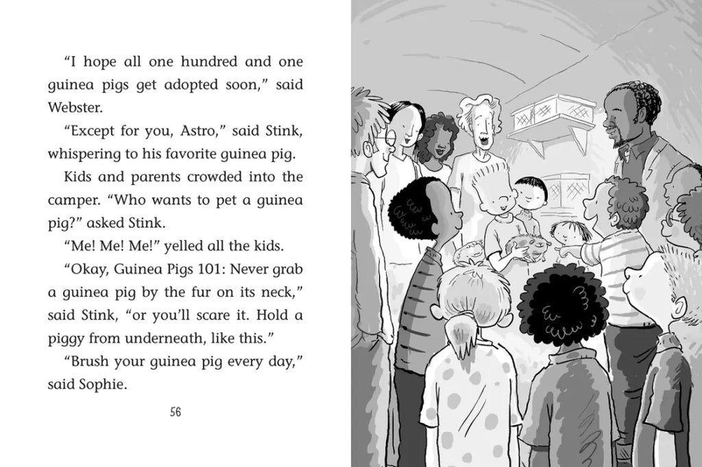When three guinea pigs from the local pet shop make a great escape, Stink Moody and his friends Webster and Sophie spring into action. Ta-da! The Fantastic Fur Friends round up the little hairballs and bring them safely back to Mrs. Birdwistle’s shop, where they discover — oohla- la! — guinea pig pandemonium! Time for the Great Guinea Pig Giveaway! Stink and company hit the road aboard the Squeals on Wheels Express in a crazy quest to fi nd good homes for 101 squealing, whistling, chirping, wiggly piggies. FUR-eaky!