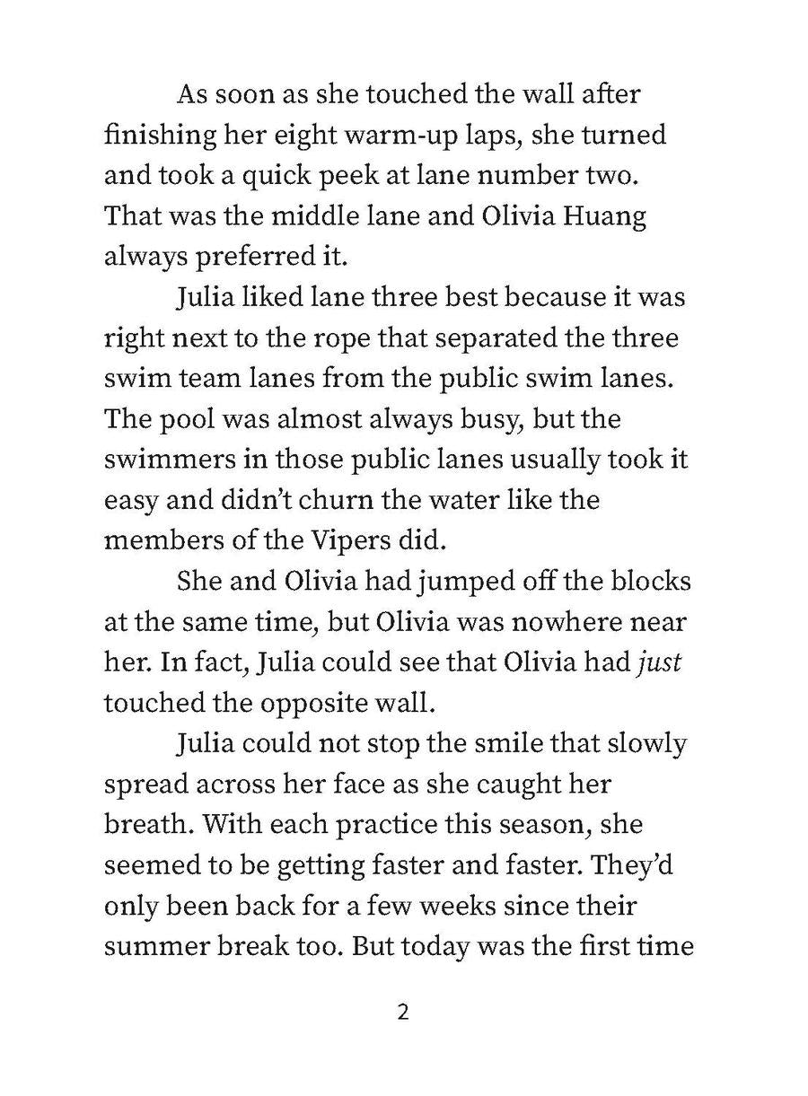 Temporarily sidelined from her swim team by an earache, Julia won't be kept down in this buoyant illustrated novel for ages 7 to 10 by acclaimed writer Angela Ahn.