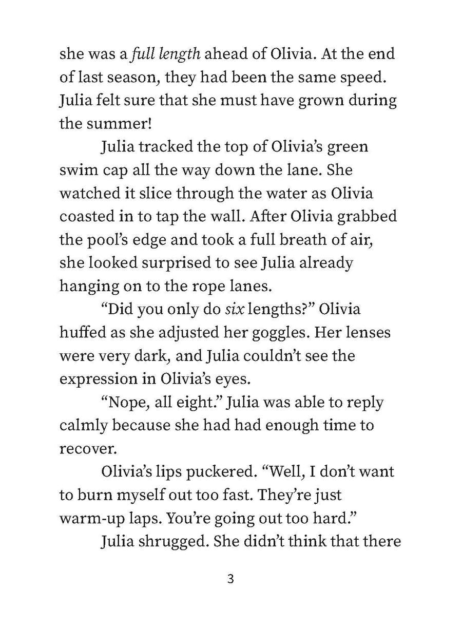 But then the worst thing happens. A sharp pain in Julia's ear reveals an infection and she's forbidden to swim for ten days. How can she get timed during Personal Best Day when she's not allowed in the water?