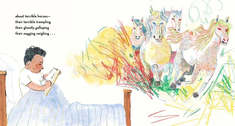 This little boy does not get on with his sister. They misunderstand each other, struggle to communicate, and they fight. Afterwards, there’s a lot of hurt, heavy feelings and loneliness. In order to escape their constant rowing and clear his head, the boy often retreats to his bedroom when he writes his stories. He writes stories about terrible horses - trampling and galloping - and he, a lone pony, who cannot compete and cannot speak. But what happens when his sister finds his book? Could it be a way for them to finally understand each other? Filled with empathy and poignance, Terrible Horses is a beautiful and powerful story of managing anger, reflection and learning to see someone else's perspective.