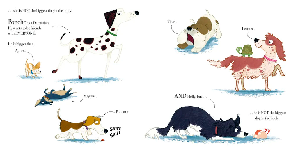 From tiny Chihuahua Agnes who loves to burrow beneath cushions, to Holly the Collie, who loves chasing her tail; from Popcorn the Beagle with the very waggly tail, to Poncho the friendly Dalmatian, this book contains a pack of adorable dogs. Each is special in their own way, but which of them is the BIGGEST dog in the book?