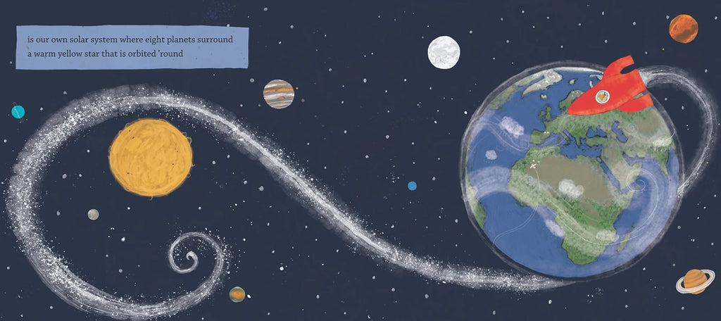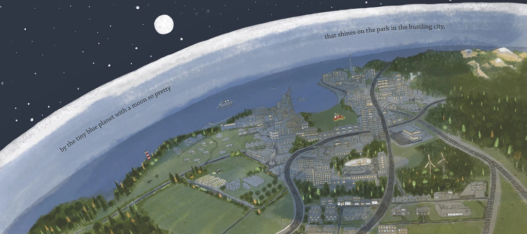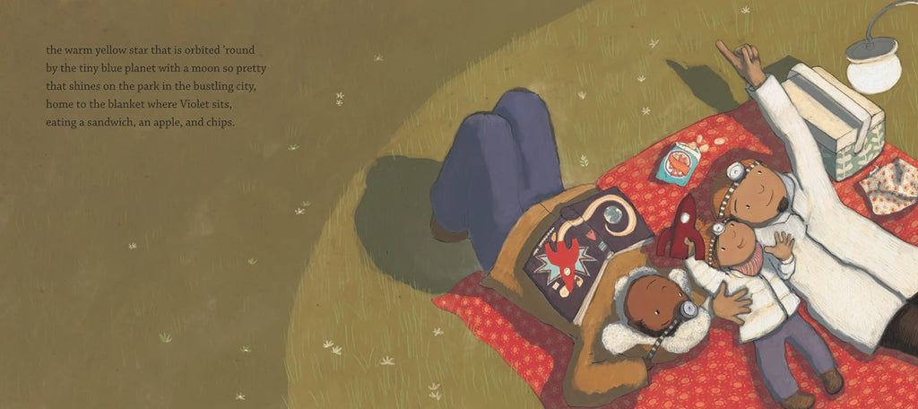 A gorgeous picture-book ode to wonder and safety, told in cumulative rhyme and with earthy illustrations evoking brick brownstones and crisp autumn skies. In a galaxy spiraling white, on a small blue planet with a moon so pretty, in a green park in a bustling city, a little girl sits on a blanket with her family, eating a sandwich, an apple, and chips. Equipped with telescope and space book, Violet gazes up into the great beyond, imagining a rocket ride to the stars . . . and a soft, sleepy return to her blanket. Lyrical and meditative, this is the perfect picture book to savor and share during a late-night picnic under the moon—or anytime.