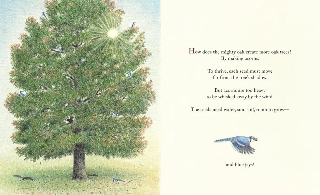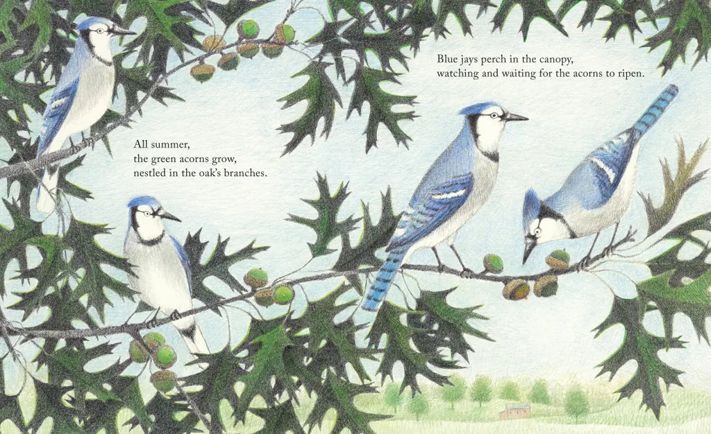 This debut picture book from poet Lynn Street lyrically celebrates the connection between blue jays and oak trees. It will appeal to readers fascinated by the behavior of birds and by the reciprocal relationships found in nature. While jays depend on acorns for food, the oak depends on jays to scatter its fruit far and wide. Blue jays have specially developed pouches in their throats that allow them to carry several acorns at a time, and they can travel as far as 1,500 miles in a season burying their acorns. A keystone species in oak forest ecosystems, these familiar birds are thought to have contributed to reestablishing oak forests after the last ice age. The detailed back matter provides further information about oaks and jays.