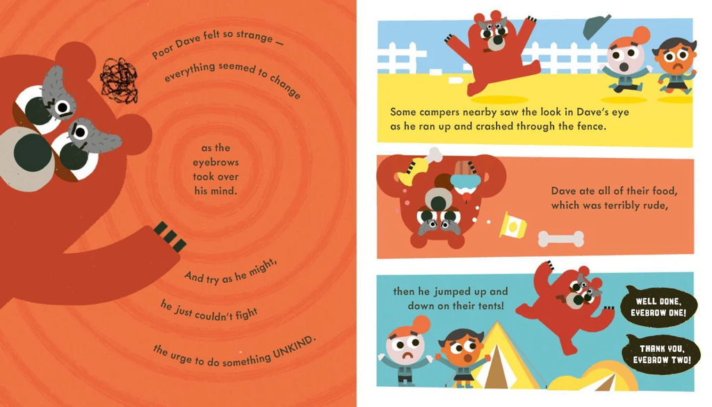 While sweeping his cave one day, a bear named Dave meets two slugs covered in fuzz who look curiously like eyebrows—and they cause hilarious trouble wherever they go!