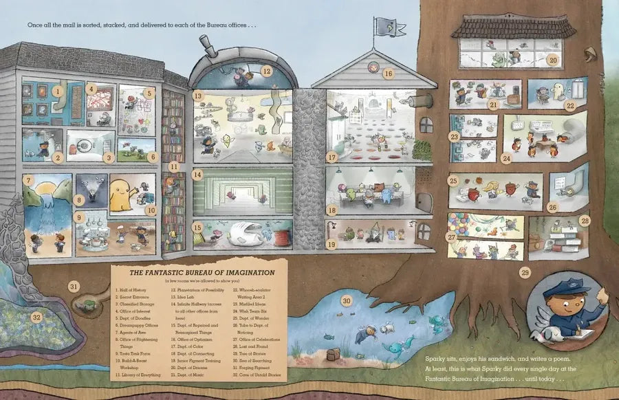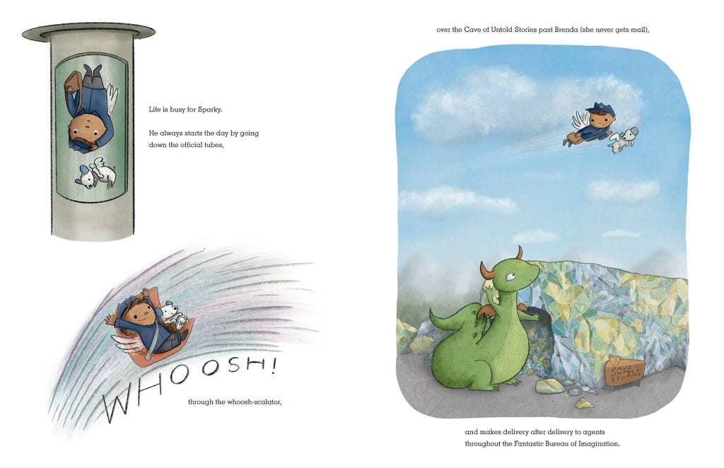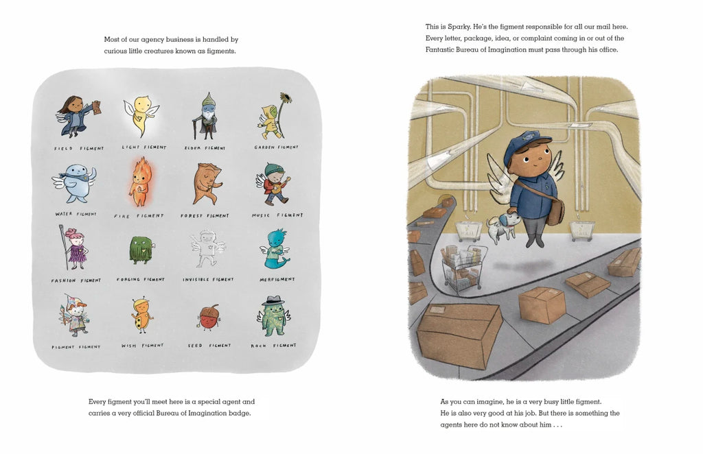 Every day, special figment agent Sparky delivers all the mail the FBI receives to the proper department, like the Office of the Unexplainable or the Department of Dreams. It's a big job, but Sparky keeps everything running smoothly . . . until disaster strikes when the Cave of Untold Stories overflows and threatens to topple the whole bureau. It turns out too many people have been holding in their big ideas, and now Sparky must recruit more agents to share their dreams, songs, and stories with the world.