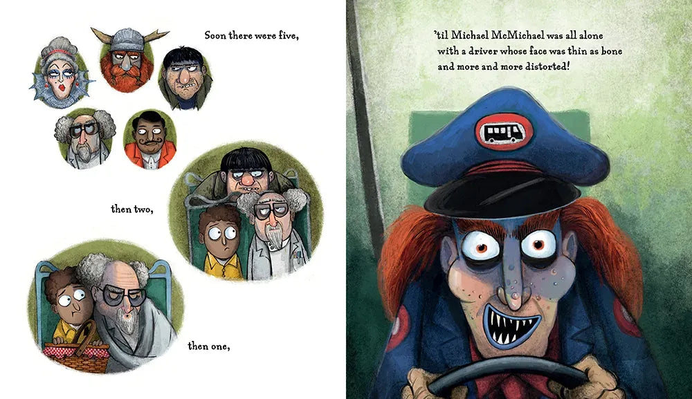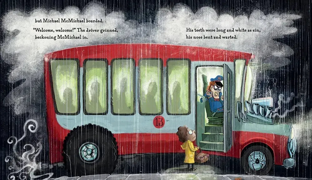 When the Thirteen bus pulls up one dreary, stormy evening, something about it doesn’t seem quite right. The driver grins down with a mouthful of long, white teeth, and there’s barely any room to sit, but Michael McMichael is bringing his gran something very dear, so he gets on board despite his misgivings. But as they travel on and the rest of the passengers get off, Michael realizes there’s nothing normal about this bus — and the driver is getting creepier by the minute. Best-selling author Bonny Becker’s cleverly rhyming text will chill and thrill readers alongside Mark Fearing’s wonderfully funny illustrations, making this book perfect for Halloween story times — and lovers of things that go bump in the night.