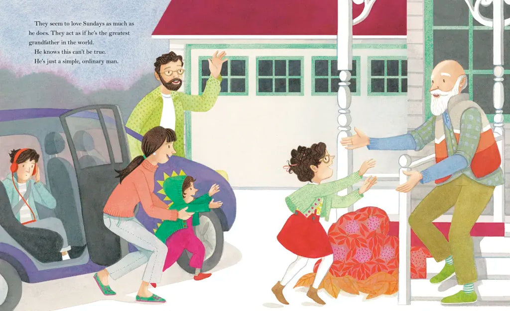Grandpa loves Sundays-- that's when his three grandchildren come to visit. They act out plays, catch fireflies in the yard, and celebrate Jewish holidays together. His grandchildren bestow affection and admiration on him. Sometimes, though, he wonders why they think he's so great? Should he tell them that he's just an average, ordinary man?