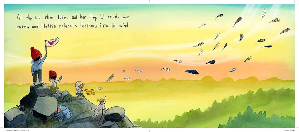 Three intrepid young female explorers set out to conquer the outdoors in their local forest, enjoying the process in their own different ways. Wren brings a sketchbook and a flag, El brings a poetry notebook, and Hattie brings feathers (and holds Bean the dog’s leash). They get lost and use maps to find their way. They draw wildlife, spot deer tracks, and see a deer before it startles and disappears, all before they finally and joyfully reach their destination.