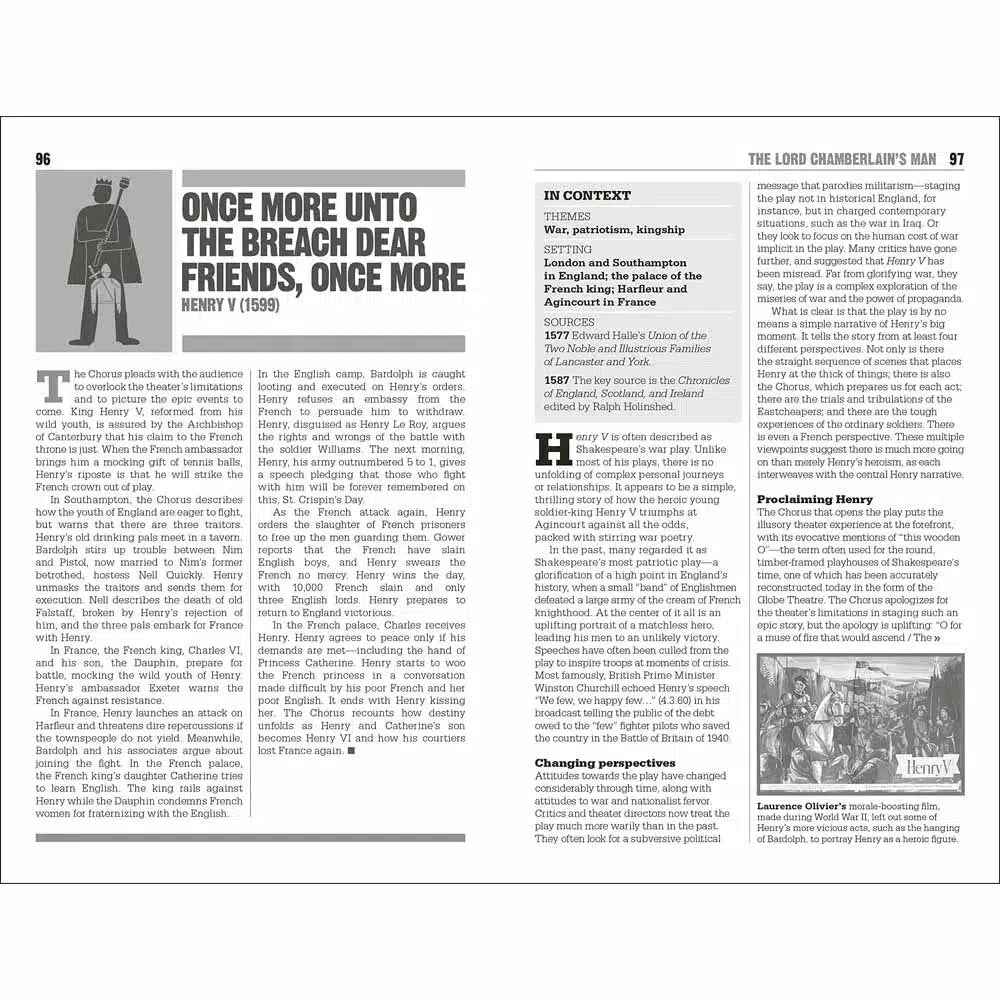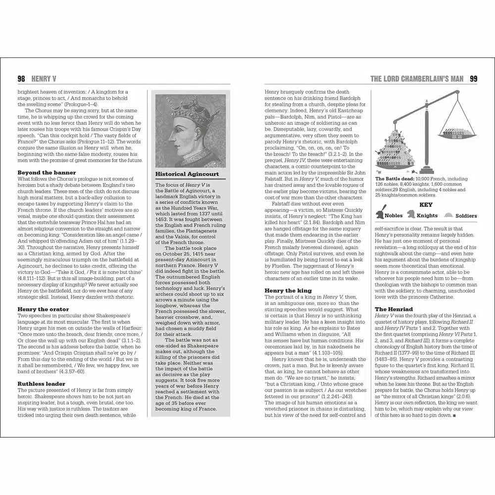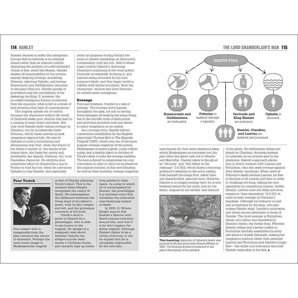 This bold book covers every work, from the comedies of Twelfth Night and As You Like It to the tragedies of Julius Caesar and Hamlet, plus lost plays and less well-known works of poetry. Easy-to-understand graphics and illustrations bring the themes, plots, characters and language of Shakespeare to life, including illustrated timelines which offer an at-a-glance summary of the action for each play. With detailed plot summaries and an in-depth analysis of the major characters and themes, this is a brilliant, innovative exploration of the entire canon of Shakespeare plays, sonnets and poetry.