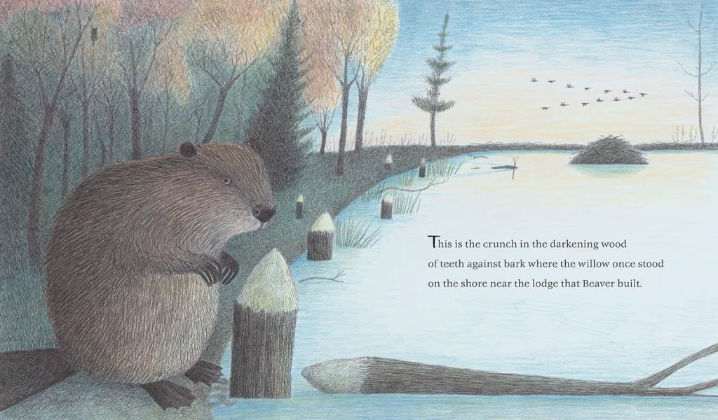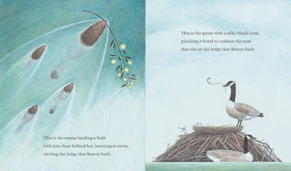 Resourceful Beaver and his family work every day to build the perfect lodge in the pond, made of branches from the shore willow and silty mud from the streambed. Secure and safe from the elements and all the forest animals who come by, the beavers sleep, play, and grow inside the lodge. But come springtime’s flood, this family of beavers will move on, leaving behind the remains of the lodge that Beaver built. Gently scientific and accessible, with soft, glowing illustrations from award-winning artist Anne Hunter, this lilting, poetic companion to The Nest That Wren Built introduces young children to the engineering feat of dam-building and the life cycle of beaver families. Budding nature lovers can explore more beaver facts, a glossary, and a list of suggested resources in the back matter.