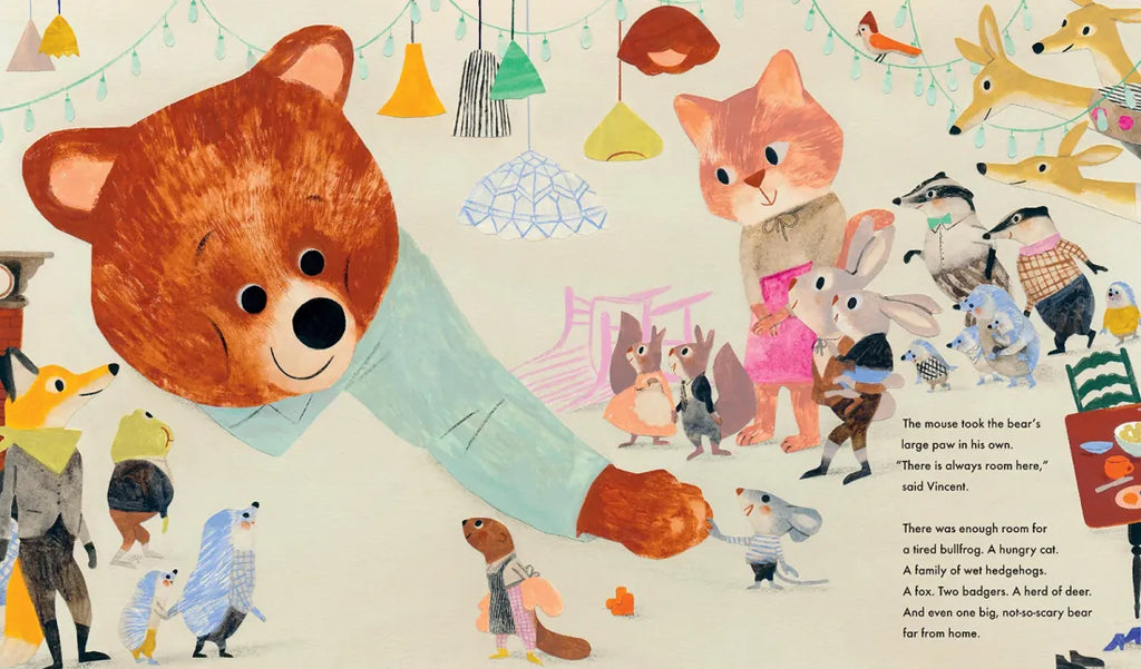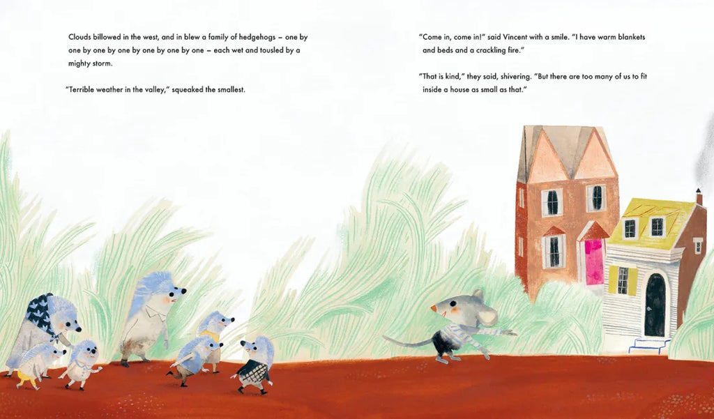 When an ordinary spot on a grassy hill calls out to him, Vincent puts down the house he carries on his back and knows he’s where he needs to be. As hungry and tired travellers pass by, Vincent welcomes them into his home, making room for everyone. And even when it seems that the house is as full as it possibly can be, there is no woodland animal too big or too scary – not a ravenous cat, nor a fox, nor a whole herd of deer – that Vincent would turn it away from his warm, magical home on the hill.