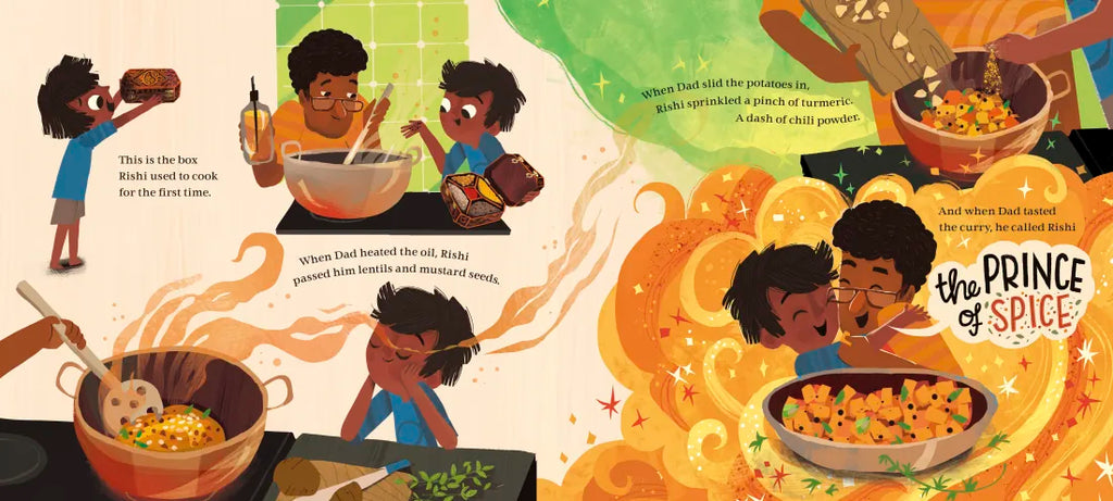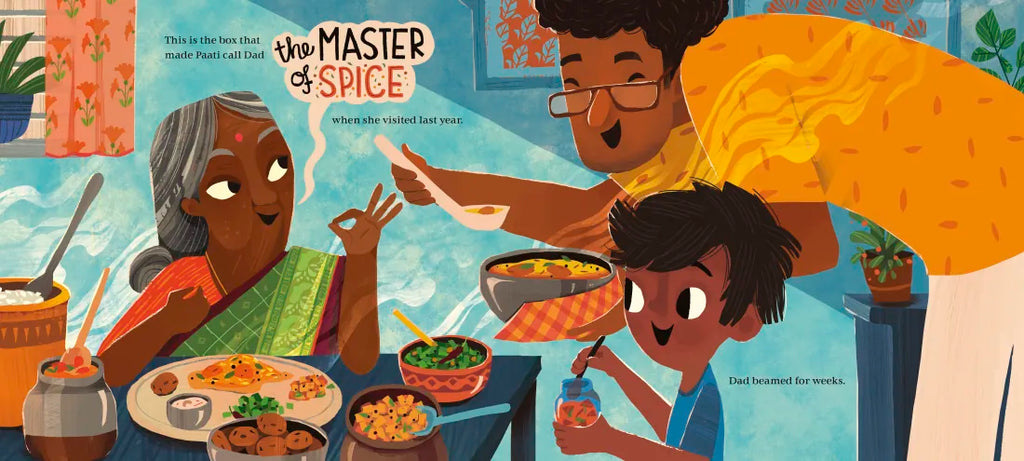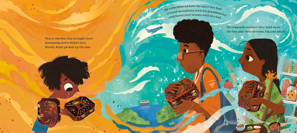 Rishi's grandma arrives from India today, and he longs to cook curry alongside his Dad using the delicious flavors from his family's spice box. But this spice box is more than just fragrant spices in shades of gold and ruby. This spice box holds memories that are passed down from one generation to the next, as each found their place in this wide world. When Rishi drops the box that holds the family's heart and history, he draws courage and meaning from their treasured past to set things right.