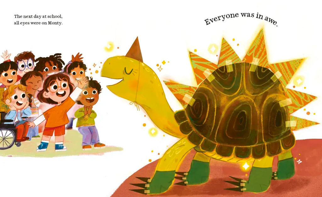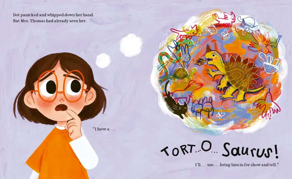 It's Dot's first day at a new school, and she is very nervous! She sits by herself at lunchtime, and at recess, she reads a book instead of playing with the other children. When the teacher asks the class if anyone has a pet, Dot tells everyone that she has a tortosaurus! Dot's tortosaurus (who's really her pet tortoise, Monty, wearing a costume) is a hit--everyone at school wants to take pictures with him. But soon, all the attention gets to be too much--and Dot finds that everyone at school is more interested in Monty than in being her friend. Will she ever make a friend?