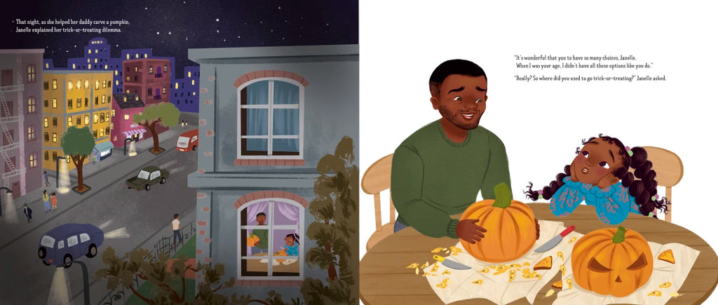 Janelle knows exactly what she wants to be for Halloween, but she has no idea how she'll celebrate—her mommy has to work and can't take her to trick-or-treat in the suburbs, and daddy has to run his store like always. But listening to her friends and neighbors' stories of Halloweens past and present, helps Janelle realize that there may be a way to celebrate the fall-iday that lets her give as much as she gets.