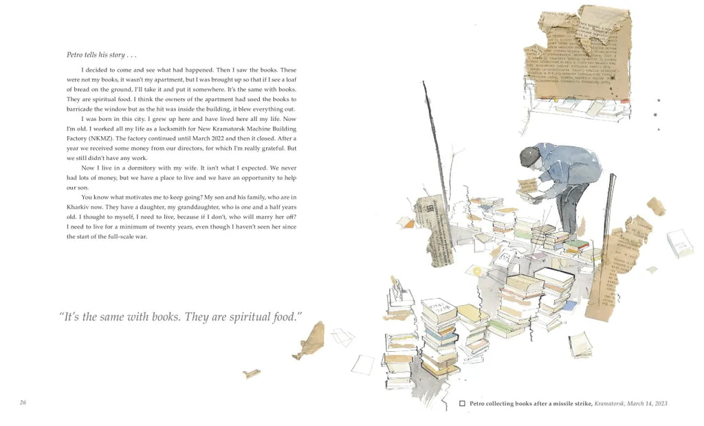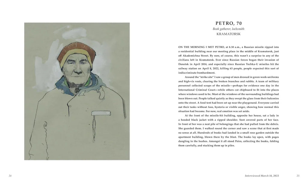 While reporting on the war in Ukraine, George Butler has created striking and intimate illustrations to introduce us to the people behind the headlines. His drawings, made in a variety of places, from missile-scarred streets to nursing homes, vividly capture stories of family, tragedy and perseverance. These powerful portraits of war and conflict are a timely reminder of the humanity we all share and our universal need for peace. A stunning, illuminating and sensitive look at stories that deserve to be told.