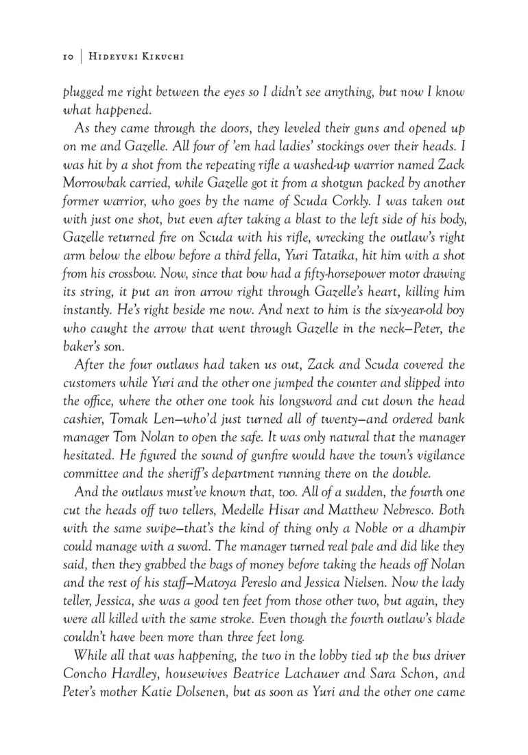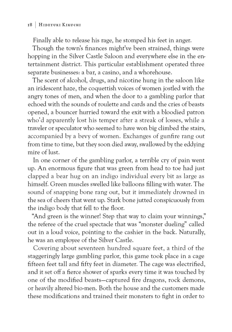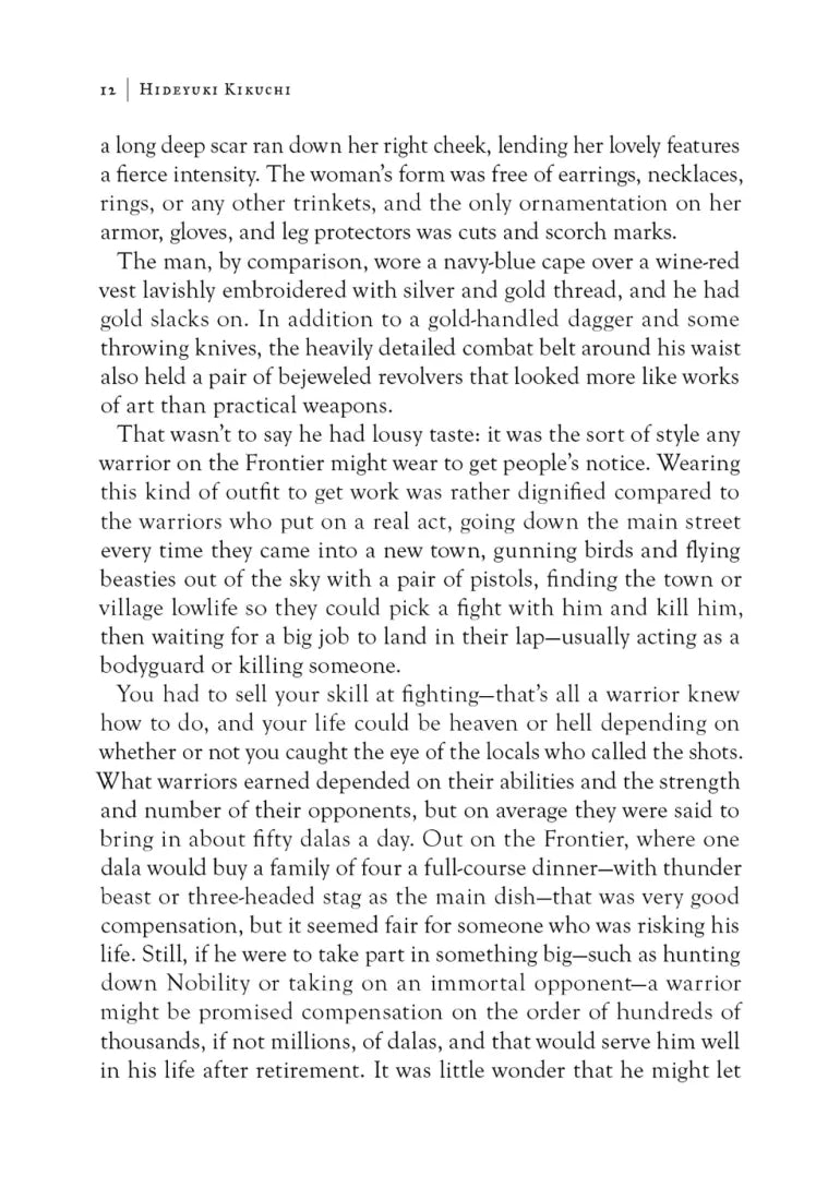 The hunt continues in the bizarre far future of 12,090 A.D, where the immortal vampire lords who were the only winners of mankind’s nuclear war still oppress the human survivors who have pushed the blood-drinking fiends back to the lawless Frontier. Yet humanity too remains as quick as ever to prey upon itself, and where the law can’t bring safety or justice, the crescent blade of D will—assuming you meet the half-vampire wanderer’s price!