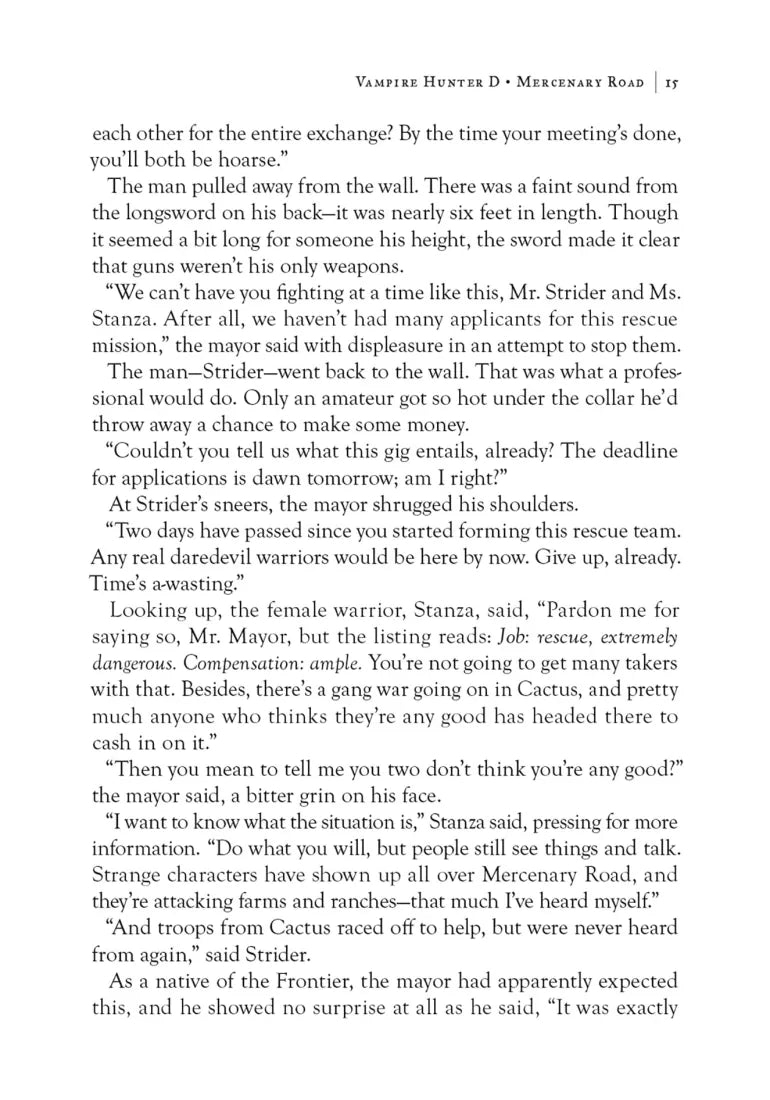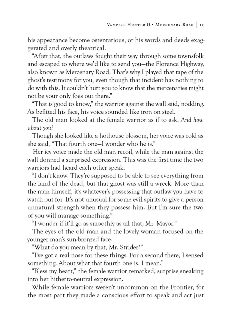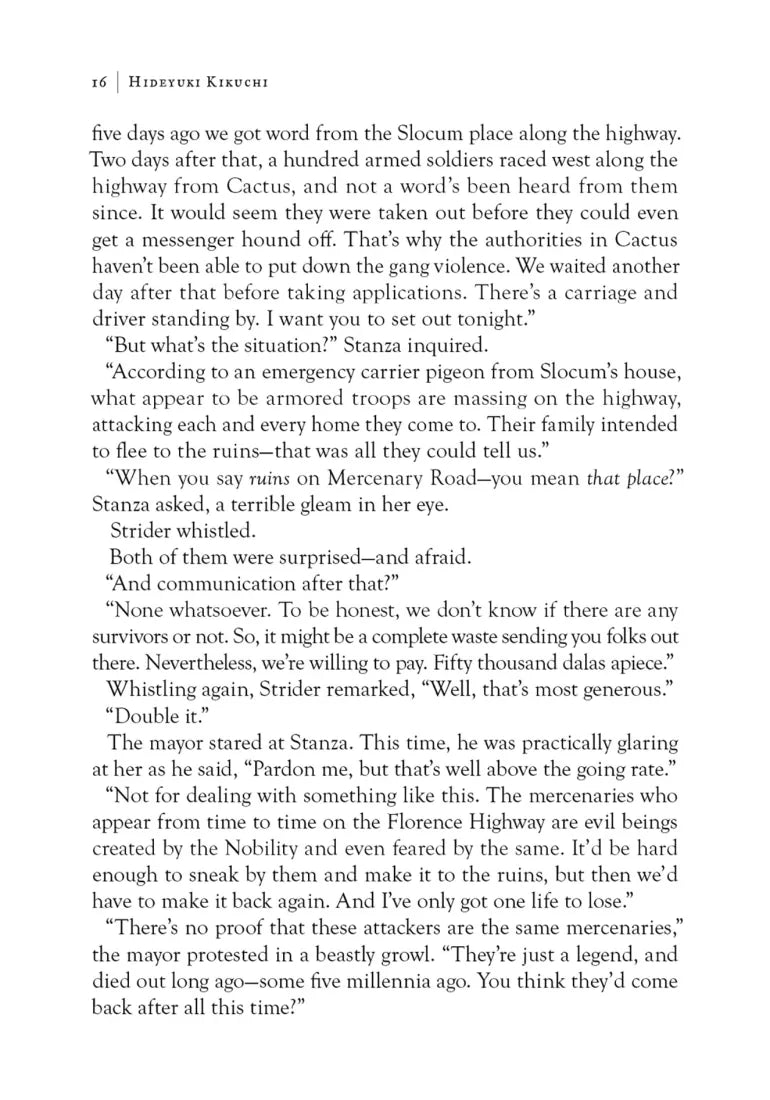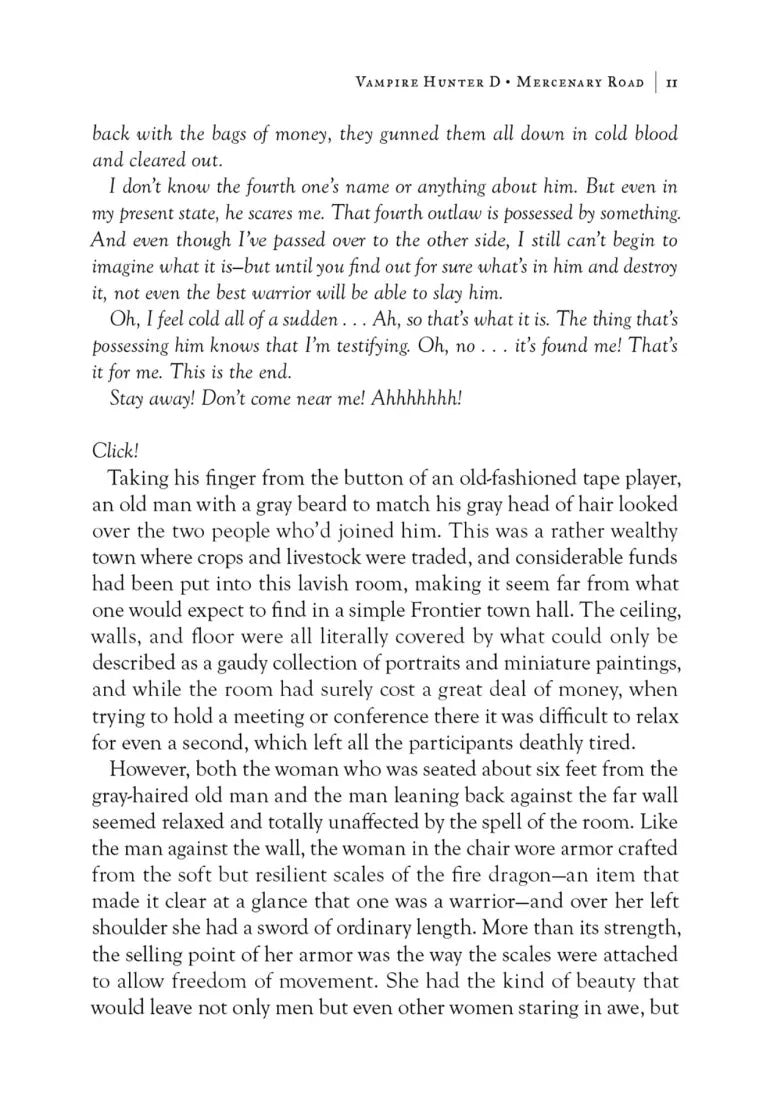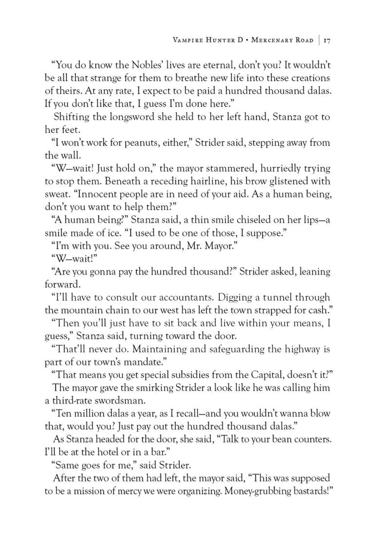 Vampire Hunter D Omnibus Book Seven collects three different complete novels. Mercenary Road leads D to a ruined castle where a family hides in hope of rescue from a resurrected horde of the undead. In Scenes From an Unholy War, D is hired to defend a village from a notorious bandit gang, but is struck by sunlight, which leaves his sentient left hand in charge while he recovers! Then, in Record of the Blood Battle, D accompanies a convoy delivering a Noble to face trial for his crimes—but when those seeking vengeance attack, will D find himself killing human vigilantes to save a vampire…?