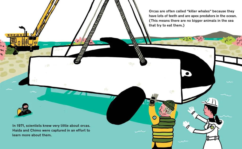 The whales are Haida and Chimo, captive orcas who lived in an aquarium called Sealand of the Pacific in the 1970s.
