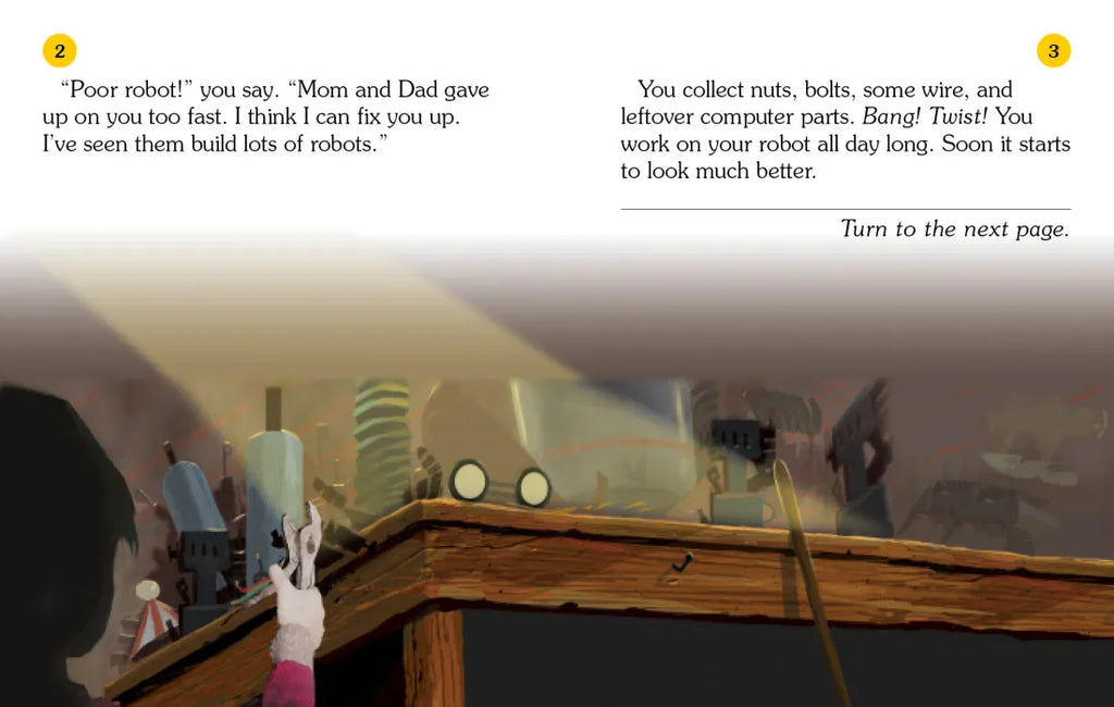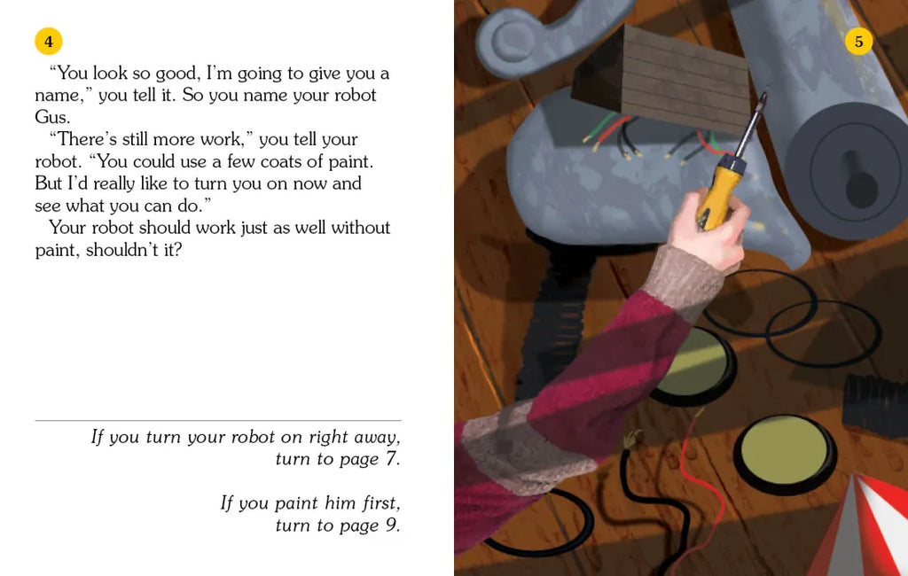 Using your scientist parents’ robot junk, YOU build your very own robot, Gus. Should you turn him on or paint him first? Your quirky robot steams when he should sing and shoots up into space without warning. Do you ask your scientist parents for help? What will your friends say if you bring him to school?